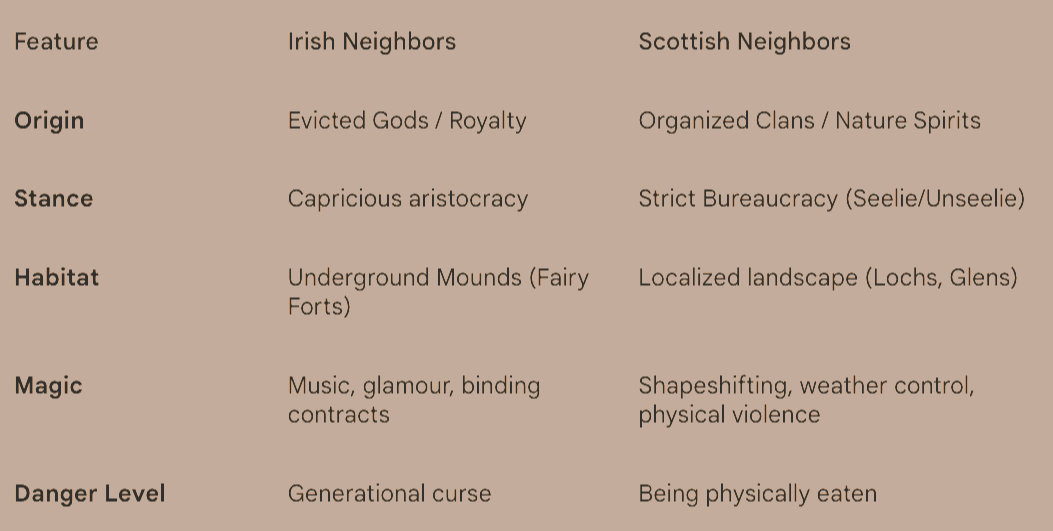 Location: They are localized. You don't have a grand host; you have the spirit of that specific loch, or the brownie living in that specific attic. Scottish magic is wilder and deeply tied to the specific geology of the Highlands or the Islands.